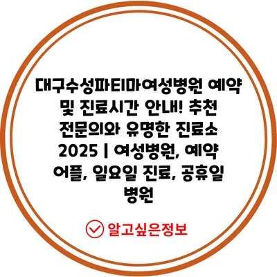 ✅ 대구수성파티마여성병원의 진료시간과 예약 방법을 지금 바로 알아보세요.