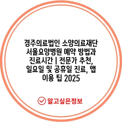경주의료법인 소양의료재단 서울요양병원 예약 방법과 진료시간 | 전문가 추천, 일요일 및 공휴일 진료, 앱 이용 팁 2025 에 대해 자주 묻는 질문 TOP 5