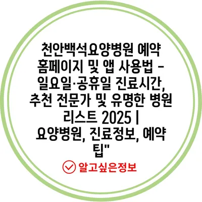 천안백석요양병원 예약 홈페이지 및 앱 사용법 – 일요일·공휴일 진료시간, 추천 전문가 및 유명한 병원 리스트 2025 | 요양병원, 진료정보, 예약 팁”