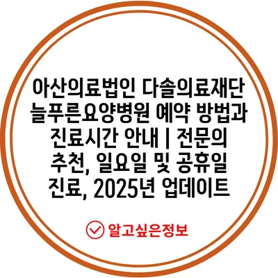 아산의료법인 다솔의료재단 늘푸른요양병원 예약 방법과 진료시간 안내 | 전문의 추천, 일요일 및 공휴일 진료, 2025년 업데이트